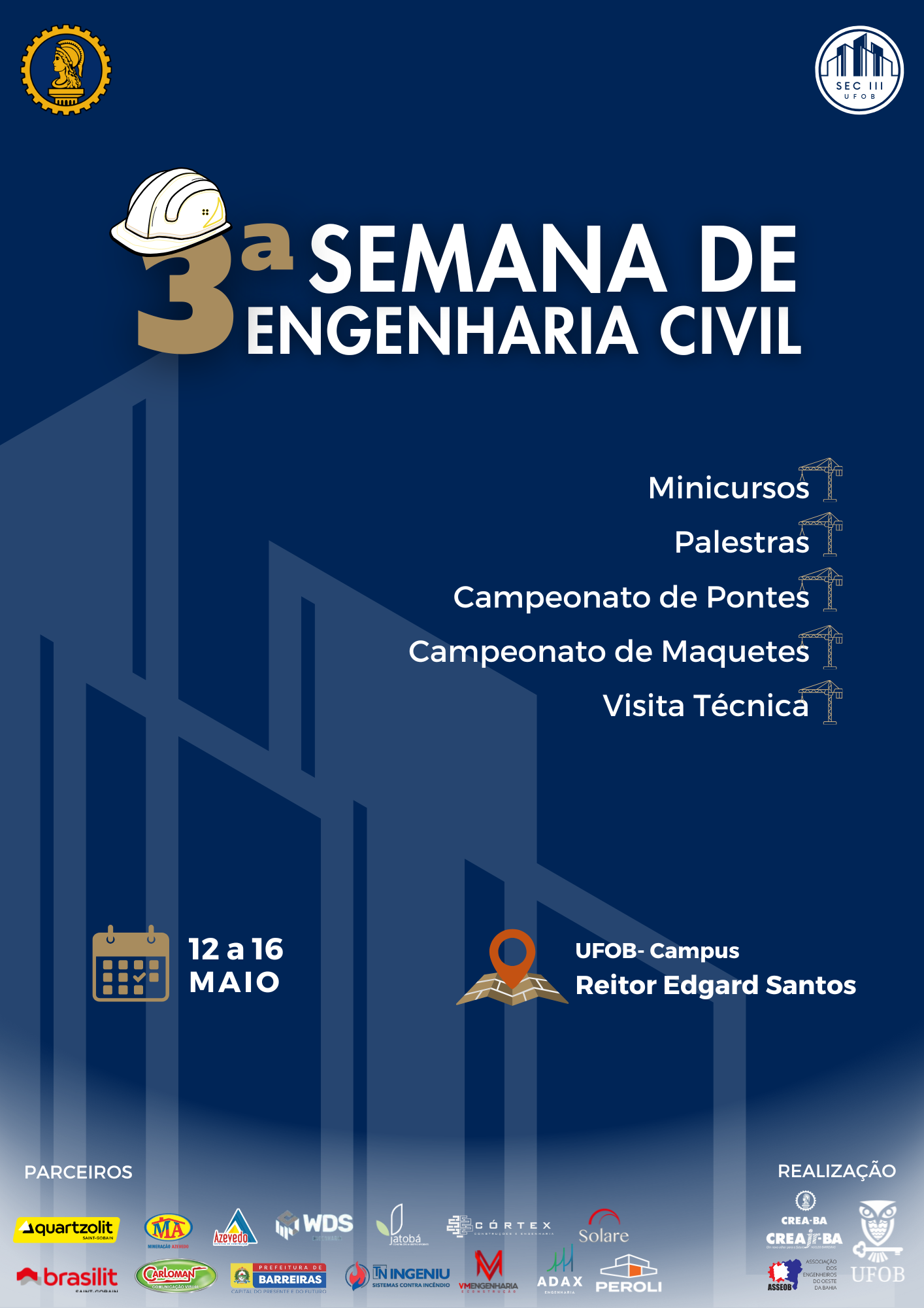 Prezados, vai ocorrer a III Semana de Engenharia Civil da UFOB no período de 12 a 16.05.2025.