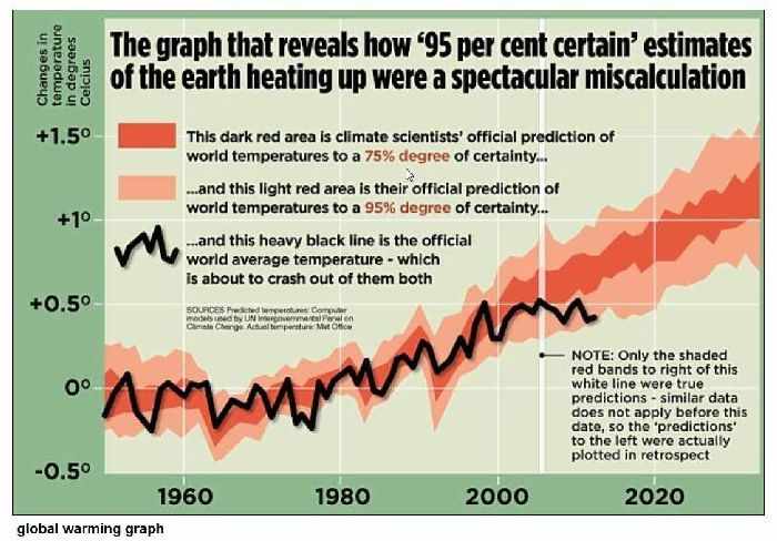 O gráfico aponta com incontrovertíveis pormenores que a velocidade do aquecimento global foi “maciçamente superestimada”. Ele mostra que não houve aumento estatisticamente significativo na temperatura média mundial desde janeiro de 1997, diz o jornal.